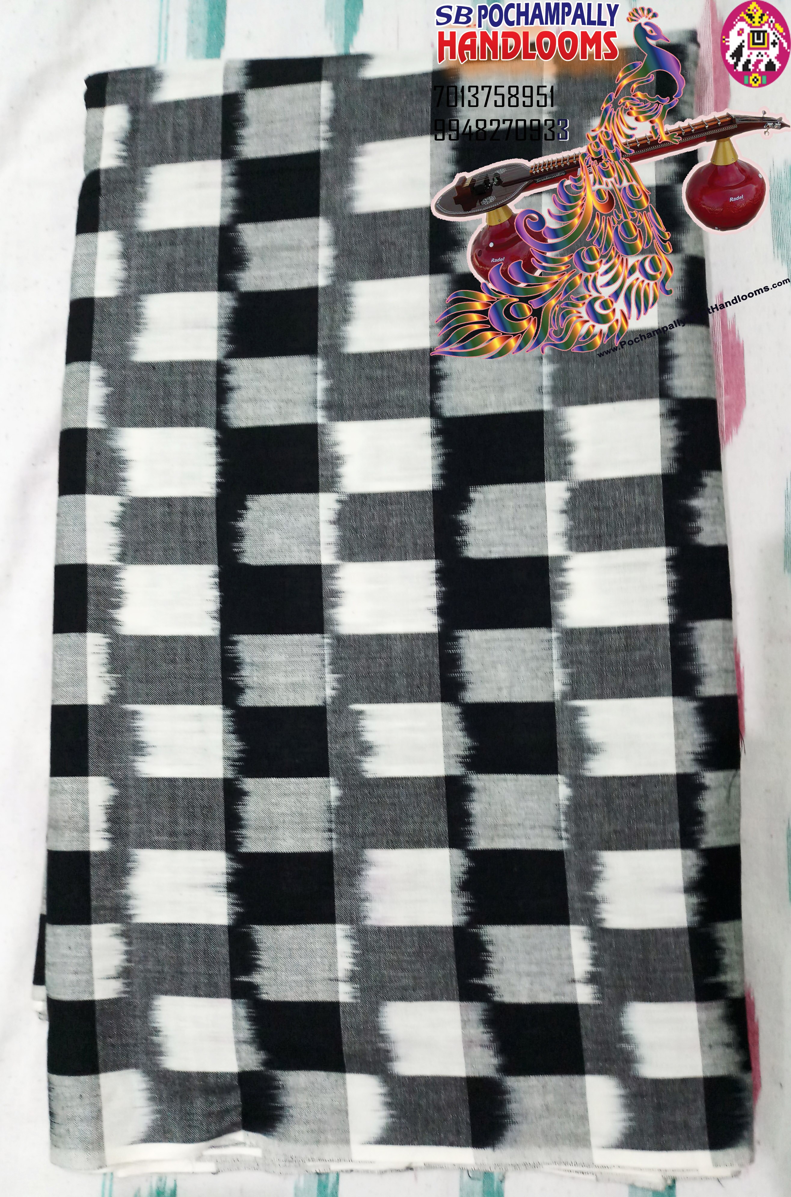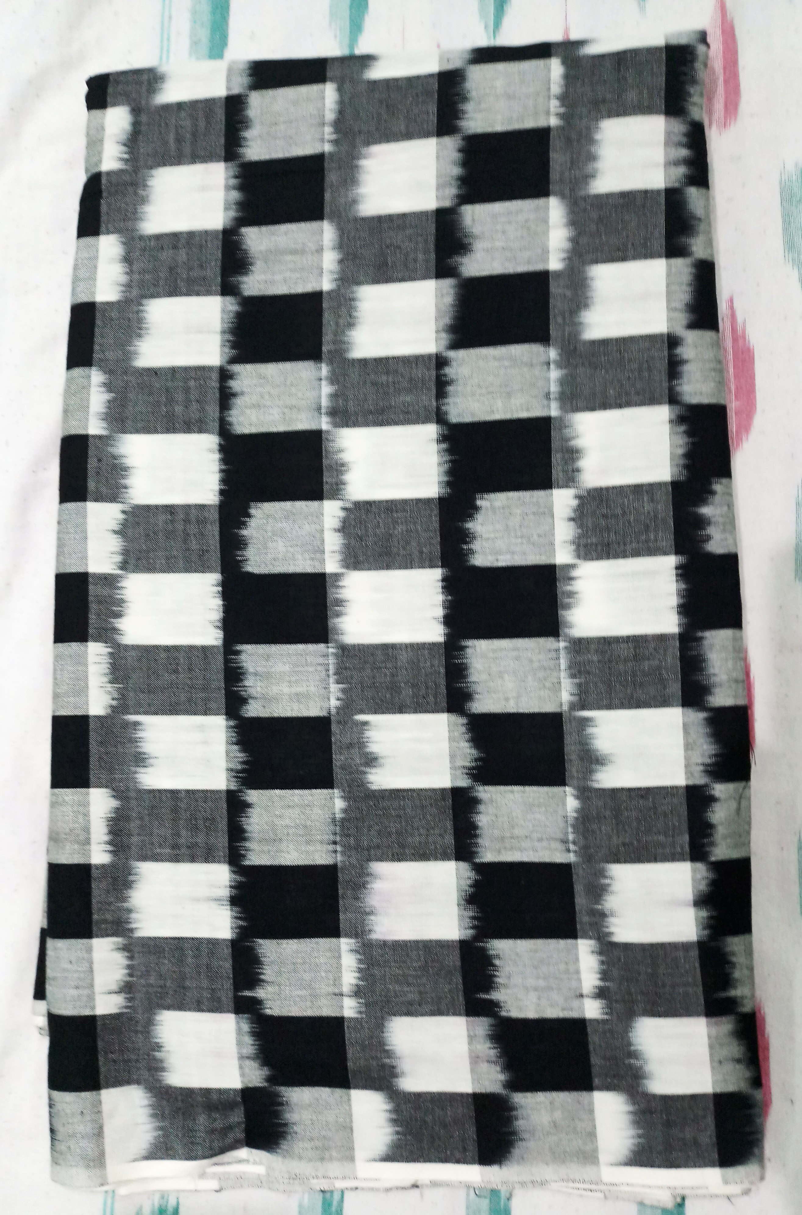 Latest Pochampally handloom Double ikkat cotton box designer fabric with black grey and white colours availlable in hyderabad store