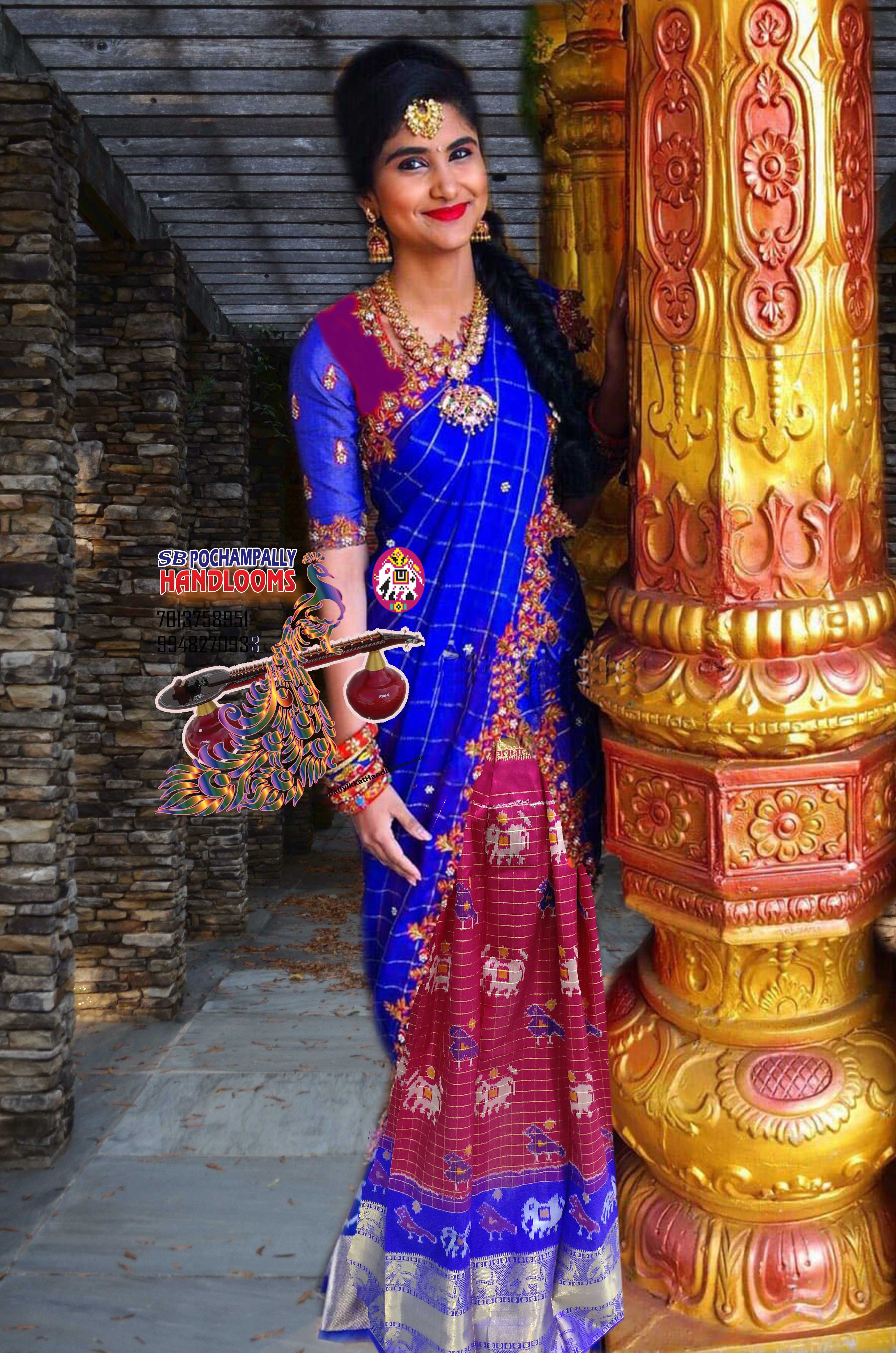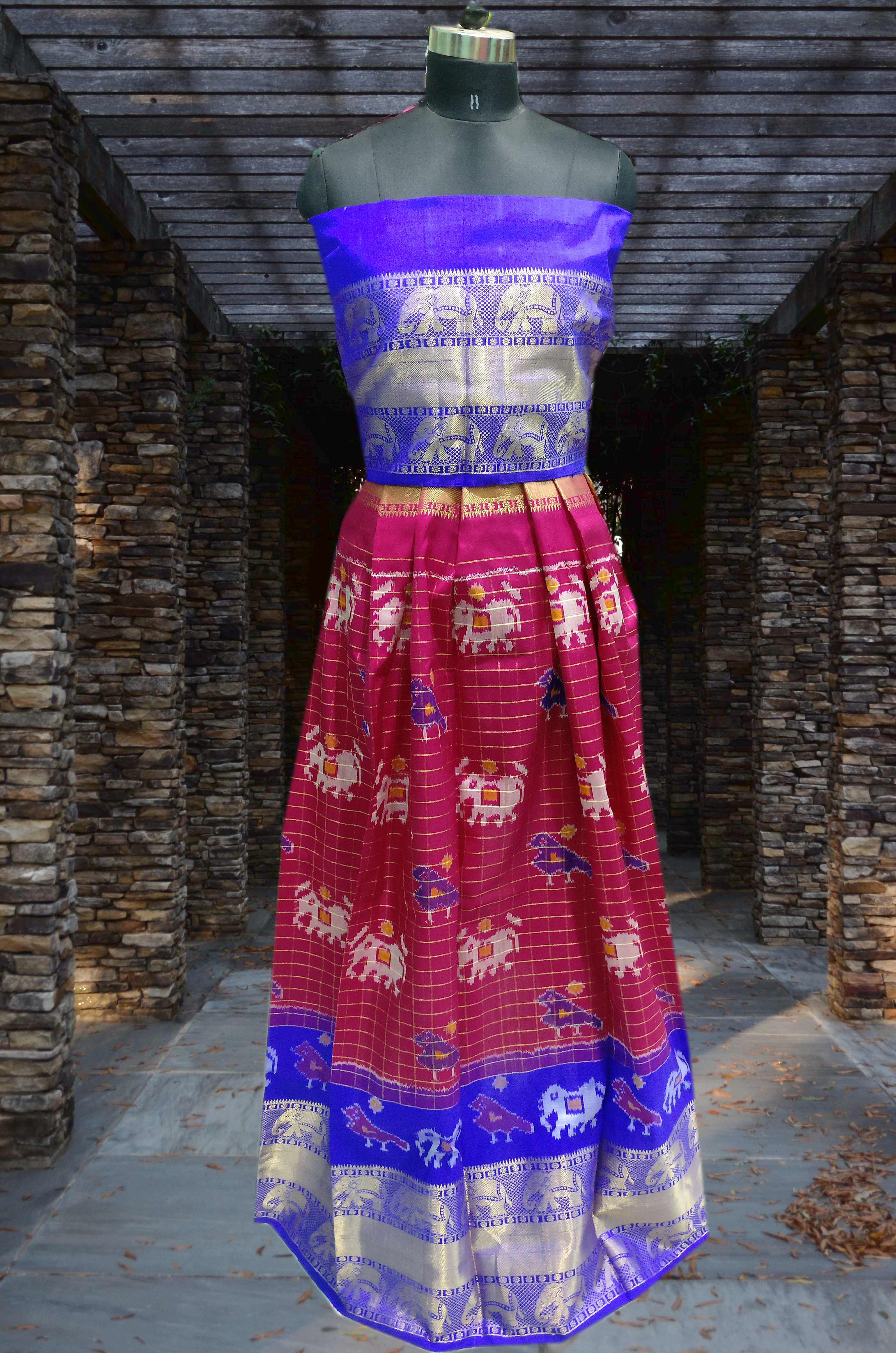 ikkat silk zari checks elephants birds design LEHENGA with jackat kanchi design skirt border majenta pink with blue colors combo