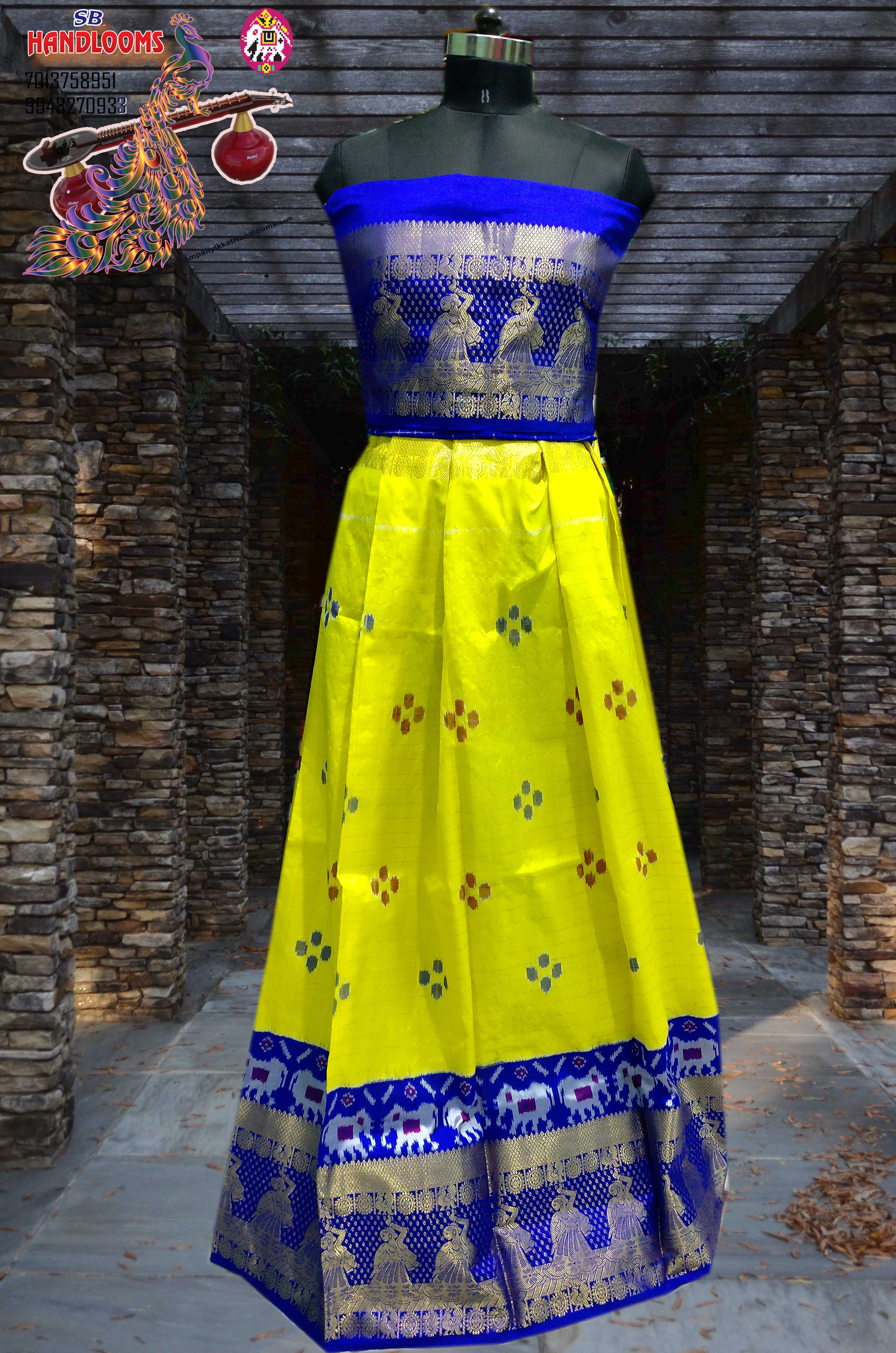 ikkat silk zari checks ikat design LEHENGA with jackat kanchi style design skirt border yellow with blue colors combo