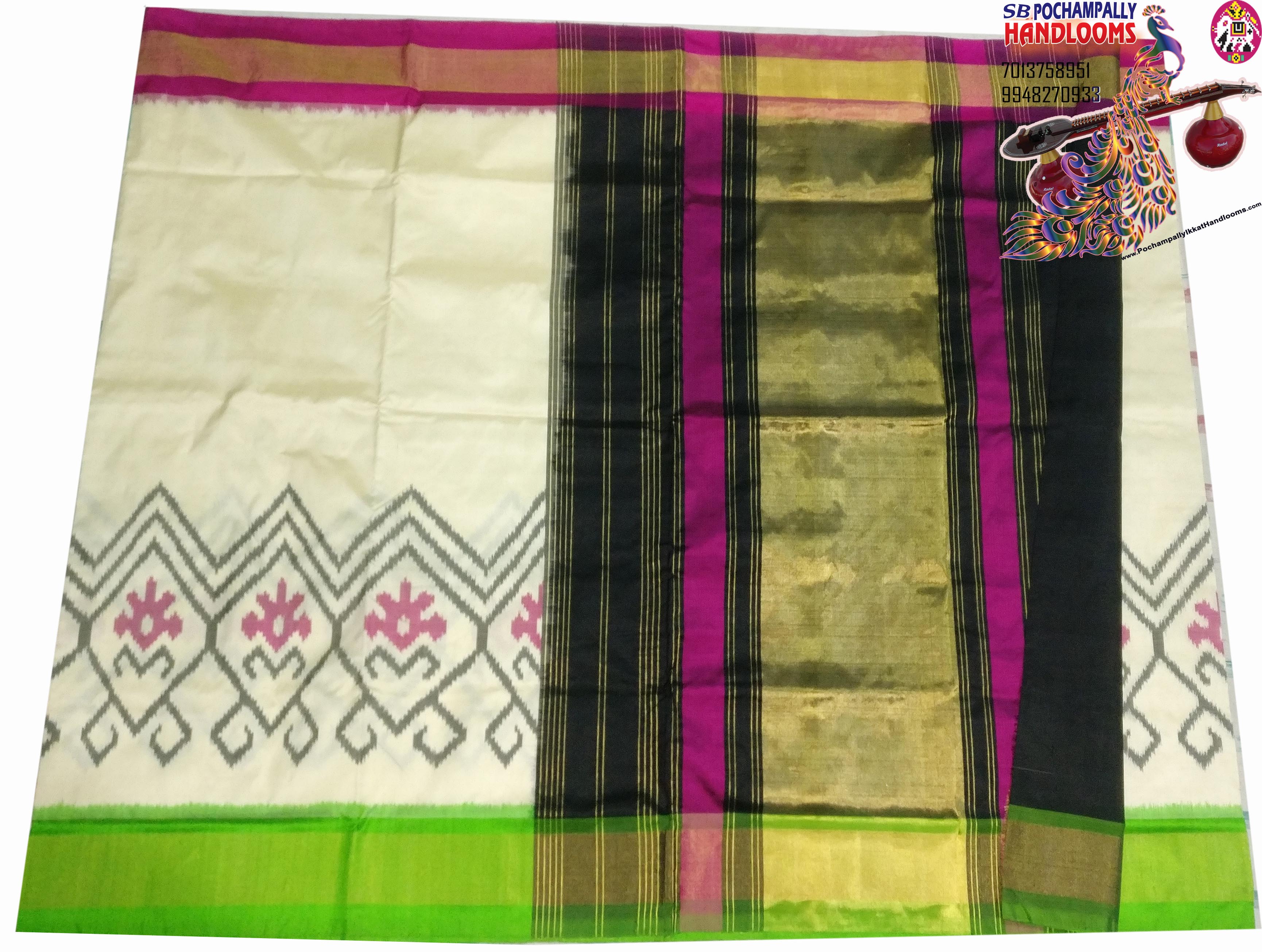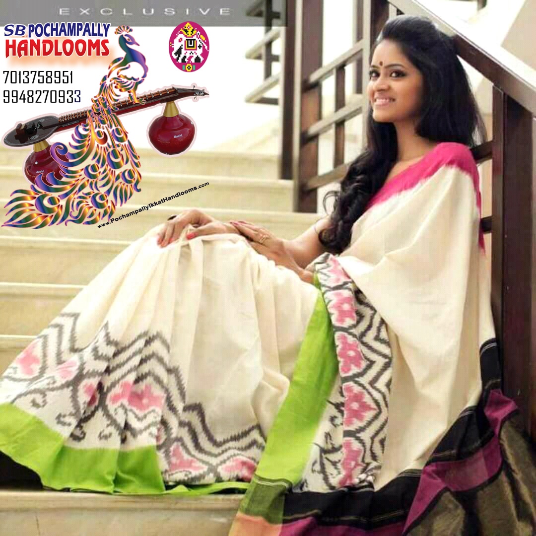 Pochampally ikat silk ganga jamuna borders floral design skirt border saree cream with pink green and black pallu and blouse are exclusive pure pattu bridal wedding wear party wear and function wear collection