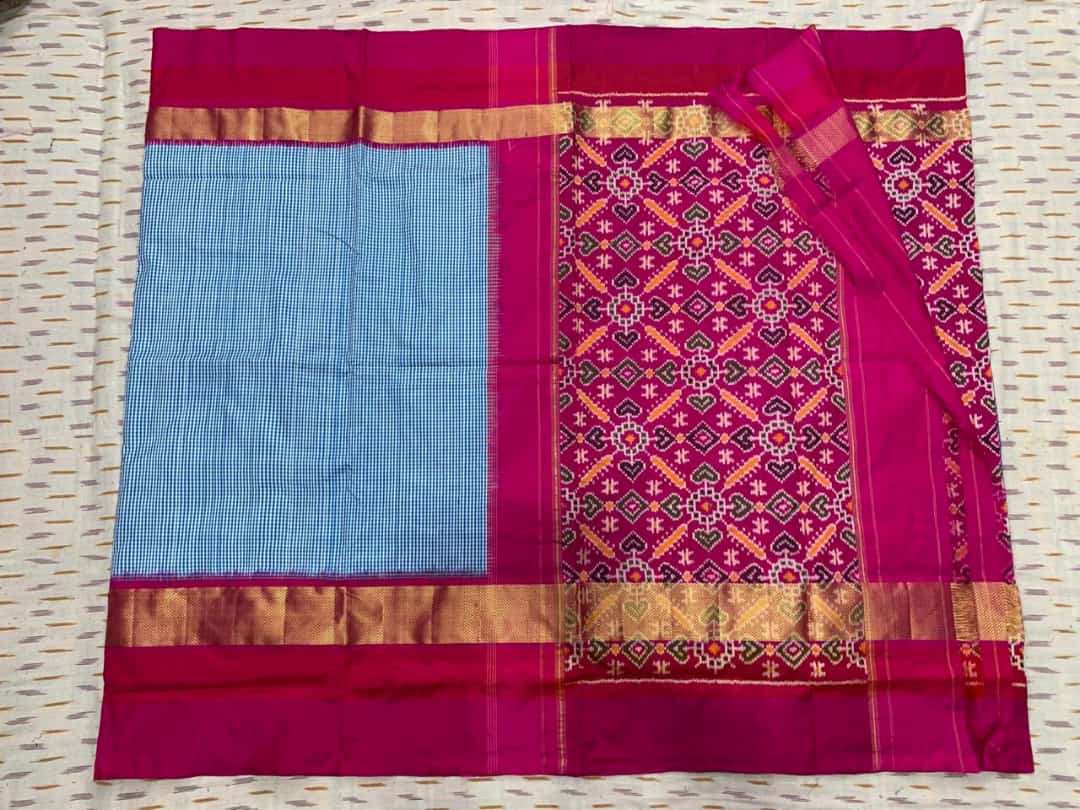 New Pochampally pattu saree. Latest Ikkat silk saree with zari pet border and pan patola design pallu and blouse. ikkat saree available in our best handloom store in hyderabad and wholesalers cum dealers of pochampally sarees. Customized blouse stitching available in Divya Creations hyderabad. we accept online orders also for tailoring.